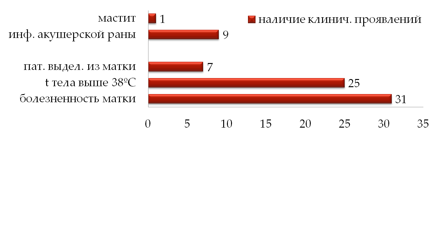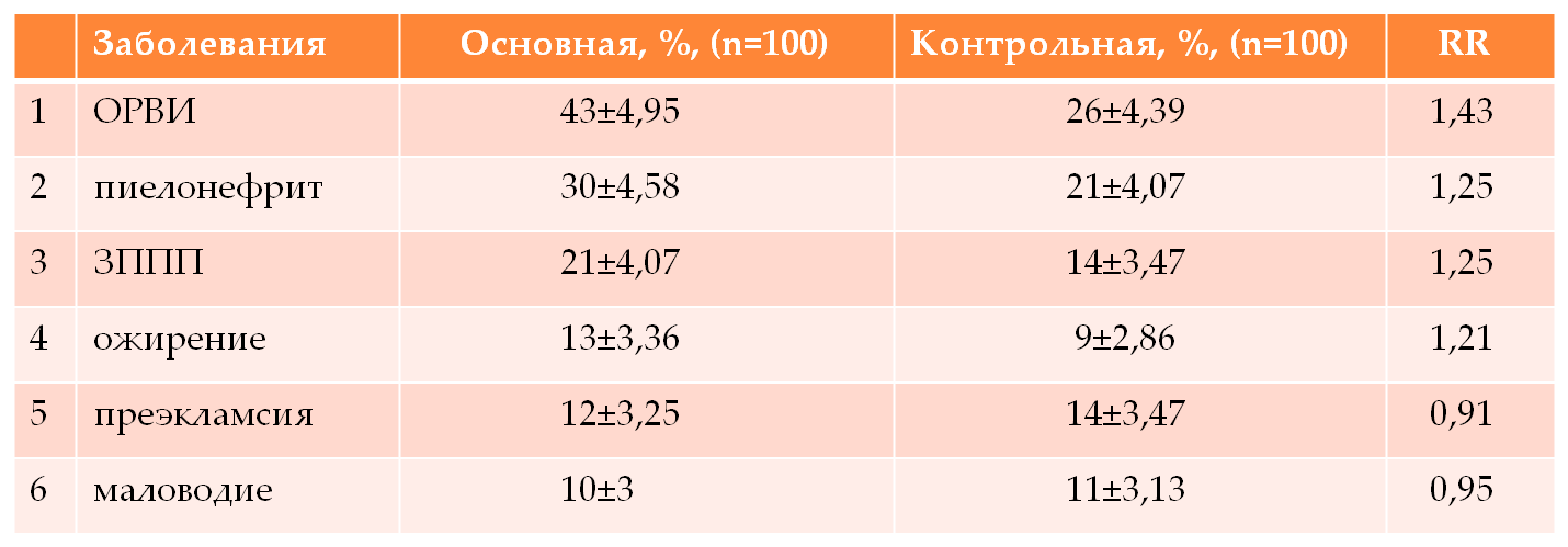 В процессе беременности 34,5% родильниц перенесли острые респираторные инфекции, 25,5% - обострение пиелинефрита, у 17,5% выявлены инфекции, передающие преимущественно половым путей (трихомониаз, хламидиоз, ЦМВ, вирус папилломы человека и пр.). Каждая 10-я женщина страдала ожирением, у 13% была диагностирована преэклампсия, у 10,5% - маловодие. Однако значимых различий в опытной и контрольной группах выявлено не было, за исключением факта заболевания респираторной инфекцией. Нами установлено, что заболевание ОРВИ в период беременности увеличивает относительный риск развития эндометрита в послеродовом периоде в 1,4 раза (OR – 2,14, RR – 1,43, χ² - 9,95).