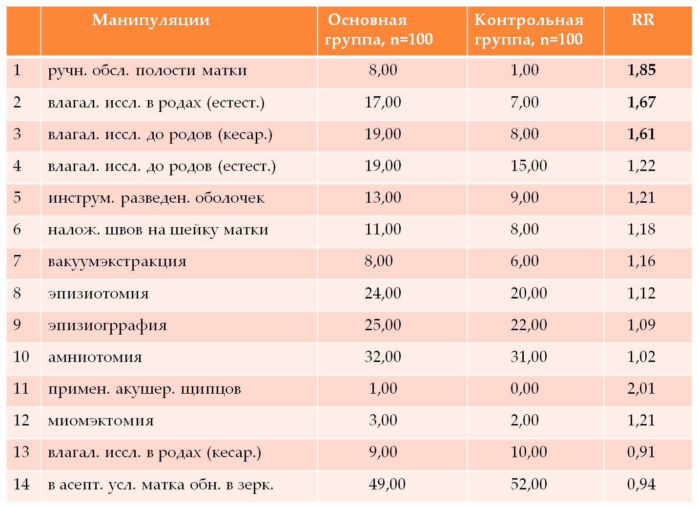 Общеизвестно, что инвазивные манипуляции во время родов и раннем послеродовом периоде влияют на развитие эндометрита. В нашем исследовании установлено, что влагалищные исследования, проведенные в дородовом периоде и в родах от 2-х до 4-х раз, увеличивают относительный риск развития эндометрита при родах через естественные родовые пути в 1,7 раза (OR – 3,3, RR – 1,67), при оперативных родах – в 1,6 раза (OR – 3,06, RR – 1,61). Проведение ручного обследования полости матки после родов увеличивает риск развития эндометрита в 1,8 раза (OR – 8,61, RR – 1,85, χ² - 5,8). Значимого влияния на риск развития эндометрита других инвазивных манипуляций (применение вауумэкстракции плода, эпизиотомии, инструментального разведения плодных оболочек, наложение швов на шейку матки, осмотр шейки матки в зеркалах) в нашем исследовании не выявлено.