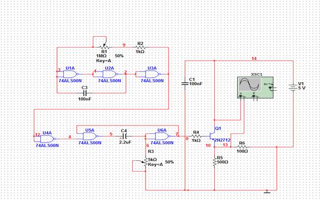 Импульсными генераторами называют электронные устройства, преобразующие энергию источников постоянного напряжения в энергию электрических импульсов. Одним из наиболее распространенных импульсных генераторов является мультивибратор. Мультивибраторы - это импульсные генераторы с положительной обратной связью, в которых усилительные элементы работают в ключевом режиме. Мультивибраторы не имеют ни одного состояния устойчивого равновесия, поэтому относятся к классу автоколебательных генераторов. На основе мультивибратора была взята схема курсового проекта.Используя четыре логических элементах 2И-НЕ, мультивибратор дает на выходе положительный импульс. Для высокой нагрузочной способности в схеме присутствует эммитерный повторитель на транзисторе.R6 служит для ограничения выходного тока и защиты перегорания транзистора. Схем курсового проекта - генератор прямоугольных импульсов: