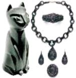 Черный непрозрачный камень с шелковистым, перламутровым блеском, представляет собой разновидность каменного угля, образовавшегося в палеозойскую эру из хвойных деревьев. Золотой век гагата пришелся на конец 19 века, когда в его промысле было занято до 1000 человек. Из легкого гагата изготавливали крупные и объемные украшения. Позже популярность гагата пошла на убыль.