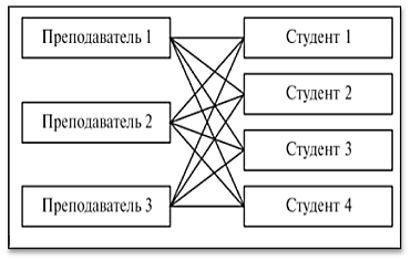Поиск данных в иерархической системе всегда начинается с корня. Затем производится спуск с одного уровня дерева на другой, пока не будет достигнут искомый уровень. Перемещения по системе от одной записи к другой осуществляются с помощью ссылок. Основные достоинства иерархической модели — простота описания иерархических структур реального мира и быстрое выполнение запросов. Однако не всегда удобно каждый раз начинать поиск нужных данных с корня, а другого способа перемещения по базе в иерархических структурах нет. Указанный недостаток снят в сетевой модели, где (по крайней мере, теоретически) возможны связи всех информационных объектов со всеми. В примере, приведенном на рис. 2 каждый преподаватель может обучать многих (теоретически всех) студентов и каждый студент может обучаться у многих (теоретически у всех) преподавателей. Поскольку на практике это, естественно, невозможно, приходится прибегать к некоторым ограничениям.