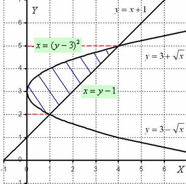 Легко заметить, что функция Нужная фигура, площадь которой предстоит найти, заштрихована синим цветом. Как найти площадь фигуры? Её можно найти «обычным» способом, который рассматривался на уроке Определенный интеграл. Как вычислить площадь фигуры. Причем, площадь фигуры находится как сумма площадей: Поэтому: Чем в данном случае плох обычный путь решения? Во-первых, получилось два интеграла. Во-вторых, под интегралами корни, а корни в интегралах – не подарок, к тому же можно запутаться в подстановке пределов интегрирования. На самом деле, интегралы, конечно, не убийственные, но на практике всё бывает значительно печальнее, просто я подобрал для задачи функции «получше». Есть более рациональный путь решения: он состоит в переходе к обратным функциям и интегрированию по оси Как перейти к обратным функциям? Грубо говоря, нужно выразить «икс» через «игрек». Сначала разберемся с параболой: Этого достаточно, но убедимся, что такую же функцию можно вывести из нижней ветки: Для самопроверки рекомендую устно или на черновике подставить координаты 2-3-х точек параболы в уравнение С прямой всё проще: Теперь смотрим на ось ! Примечание: Пределы интегрирования по оси Находим площадь: На отрезке Обратите внимание, как я осуществил интегрирование, это самый рациональный способ, и в следующем пункте задания будет понятно – почему. Для читателей, сомневающихся в корректности интегрирования, найду производные: Получена исходная подынтегральная функция, значит интегрирование выполнено правильно. Ответ: 2) Вычислим объем тела, образованного вращением данной фигуры, вокруг оси Перерисую чертеж немного в другом оформлении: