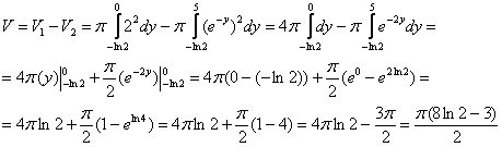 А вот и преимущество интегрирования, о котором я недавно говорил, гораздо легче найти Ответ: Однако нехилая бабочка. Заметьте, что если эту же плоскую фигуру вращать вокруг оси Пример 6 Дана плоская фигура, ограниченная линиями 1) Перейти к обратным функциям и найти площадь плоской фигуры, ограниченной данными линиями, интегрированием по переменной Это пример для самостоятельного решения. Желающие также могут найти площадь фигуры «обычным» способом, выполнив тем самым проверку пункта 1). А вот если, повторюсь, будете вращать плоскую фигуру вокруг оси Полное же решение двух предложенных пунктов задания в конце урока. Да, и не забывайте наклонять голову направо, чтобы разобраться в телах вращения и в пределах интегрирования! Хотел, было уже, закончить статью, но сегодня принесли интересный пример как раз на нахождение объема тела вращения вокруг оси ординат. Свежачок: Пример 7 Вычислить объем тела, образованного вращением вокруг оси Решение: Выполним чертеж: