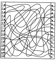 С о д е р ж а н и е р а б о т ы. Студенты образуют пары: испытуемый – исследователь. Исследователи быстро, в течение 1 – 2 мин, рисуют каждый для своего испытуемого по одной таблице такого типа, как указано на рисунке справа, и раздают их испытуемым. Испытуемые по команде экспериментатора в течение 3 мин, не пользуясь указкой или карандашом, а только с помощью глаз, находят конец каждой линии и помечают ее соответствующим номером в правом столбике, как это показано для линий 1 и 2 на рисунке. Через 3 мин исследователи прерывают работу испытуемых и, проверив ее, оценивают степень устойчивости произвольного внимания по количеству правильно найденных за 3 мин концов линий.