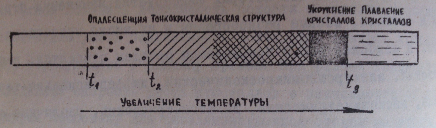 Рисунок 3.1 – Схема структурных изменений в стекле, термообработанном в градиентной печи Температурный интервал Исключение составляют некоторые составы, склонные к микроликвации с образованием сравнительно крупных областей. В температурном интервале По градиентной пробе можно также установить рентгеновским анализом фазовый состав, соответствующий непосредственно той или иной температуре. Методом дифференциально-термического анализа можно сравнительно точно определить температуры образования кристаллов разных фаз по экзотермическим пикам. На рисунке 3.2 показана кривая ДТА для случая образования двухфазовой системы. Эндотермический эффект соответствует температуре размягчения стекла.