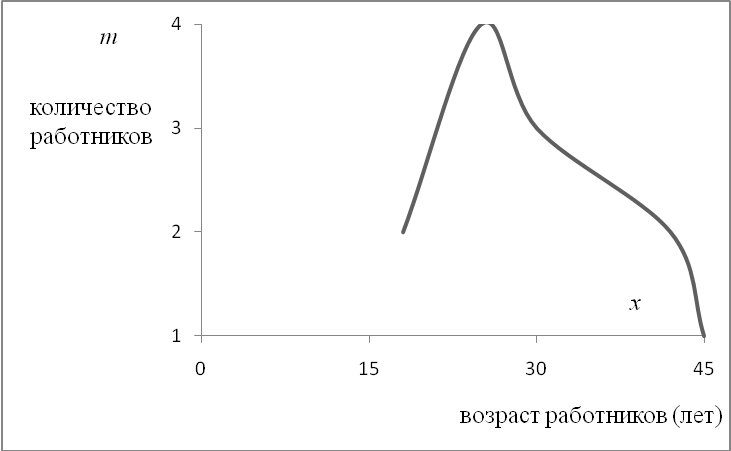 Построение вариационного ряда (ряд распределения) – это упорядоченное распределение единиц совокупности по возрастающим или убывающим значениям признака. В составе любого вариационного ряда можно выделить три основных элемента: варианта, частота и частость. Варианта – это значения, которые принимает исследуемый признак и обозначается через x. Частоты вариационного ряда – абсолютная численность отдельных групп с различными значениями признака, обозначается через m. Частости вариационного ряда – удельные веса (доли) отдельных групп в общей совокупности. Вариационные ряды бывают двух видов: - дискретные; - интервально-вариационные. В дискретных рядах варианты представлены в виде целочисленных величин. Если варианты представлены в виде интервалов, то такие ряды называются интервально-вариационными. Для анализа вариационных рядов и определения формы распределения используются графики. При графическом изображении вариационного ряда в статистике используется полигон распределения, гистограмма и кумулята. Чтобы построить полигон распределения на оси абсцисс отмечают точки, соответствующие величине вариант значений признака из них восстанавливаются перпендикуляры, длине которых соответствует частота этих вариант по принятому масштабу на оси ординат. Вершины перпендикуляров соединяются отрезками прямой. Графическое изображение дискретного ряда, приведенного в таблице 4.2, глава «Средние величины») представлено на рис. 5.1.