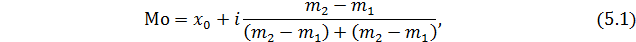 Общее количество семей 100, следовательно, в середине ряда находится семья с порядковым номером 50,5. Первая накопленная частота, которая больше данного значения, равна 80 и соответствует варианте 2. Таким образом Ме=2 чел. Это означает, что половина семей имеет в своем составе до 2 детей, а половина – больше. Расчет моды и медианы в интервально-вариационном ряду производится по формуле: Мода определяется как: