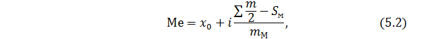б) далее рассчитываются накопленные частоты; в) устанавливается первая накопленная частота, которая превышает половину объема ряда.