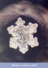 Эти снимки кристаллов были сделаны после того, как стеклянные бутылки с водой помещали между двух стереоколонок. Музыка Бетховена породила причудливые кристаллы с большим количеством мелких, тонких деталей.