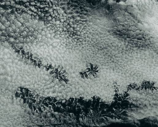 Лучевые облака или аctinoform – обширные формирования низких облаков в прибрежных районах, которые принимают различные формы. Они получили свое называние в честь греческого слова «луч» в связи с их радиальной структурой. Лучевые облака могут распространяться на 300 километров. Увидеть их можно только с помощью спутника.