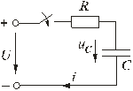 uCсв = A e-t/τ, τ = RC. Полагаем, что до замыкания ключа конденсатор не был заряжен (Uс(0-) = 0). На основании законов коммутации uC(0-) = uC(0+) = 0, при t = 0; следовательно: uC(0) = uCу(0) + uCсв(0) или 0 = U + A, откуда А = -U. Тогда переходное напряжение на конденсаторе uC = U (1 - e-t/τ), а переходный ток в цепи