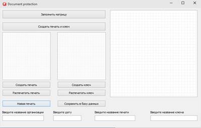 Рис.1 Главная форма. Потом пользователь должен нажать клавишу «Заполнить матрицу», и после нарисовать символ или число (рис. 2). Рис. 2 Заполнение матрицы Далее пользователь нажимает клавишу «Создать печать и ключ», программа случайным образом делит рисунок из первого поля на равные части и переносит их в два других (рис. 3).