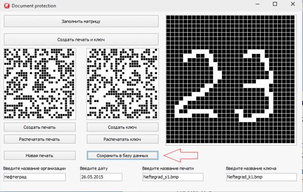 1. Аналитическая часть. 1.1. Описание функциональных требований. 1.1.1. Запуск программы. При запуске программы пользователь увидит (главное) поле для рисования своей печати и два поля для ее деления на две части. Так же там присутствуют кнопки для: - Заполнения матрицы - Создание печати и ключа - Создания печать - Создание ключа - Распечатывания печати - Распечатывания ключа - Новая печать - Сохранить в базу данных Присоединена база данных для сохранения использованных организаций, а так же для сохранения даты, название сохраненной печати и ключа. 1.1.2. Главная рабочая форма. При входе пользователь видит окно, где находятся три поля. Первое (главное) для рисования печати, а второе и третье для их деления. Пользователю первым делом в любом случае нужно нажать на клавишу «Заполнить матрицу», после чего в первом (главном) поле требуется рисовать числа или рисунок. Далее пользователь обязан нажать на кнопку «Создать печать и ключ». После чего программа берет рисунок из первого (главного) поля и рандомно делит его на две равные части, где одна часть переносится на второе поле, а вторая часть оказывается в третьем поле. Под вторым и третьим полем находится по две клавиши. После того как программа поделила матрицу и вставила в определенные поля, пользователю нужно под вторым полем нажать кнопку «Создать печать». Далее вылезает окошко, в котором нужно указать путь к сохранению печати (Я создал в папке с программой папку под название «Stamp», можно использовать ее, для упрощенного пользования). После того как мы указали путь, чуть ниже есть кнопка «Распечатать печать». Перед тем как ее нажать нужно, открыть документ, на котором должна быть печать. Теперь нам нужно вставить нужную печать, которую мы возьмем из папки, в которую сохраняли печать (печать можно вставить в любое удобное место документа). Теперь мы смело можем нажимать клавишу «Распечатать печать». Следующий наш шаг состоит из проделывания похожей операцией, только с ключом. Под третьим полем есть клавиша «Создать ключ», при ее нажатии вылезет еще одно окошко, в котором нужно выбрать путь сохранения ключа (в папке программы есть папка «Key», для упрощенного пользования). Чуть ниже находится кнопа «Распечатать ключ». Мы должны положить в принтер специальную прозрачную пленку, при нажатии кнопки, на пленке появится рисунок из третьего поля. После проделанных операций описанных выше, пользователь должен взять прозрачную пленку и приложить к документу, где пользователь увидит рисунок, который он рисовал в первом поле. В приложении находится клавиша «Новая печать». Эта клавиша нужна для заполнения базы данных. Далее пользователь должен в строках ввести: 1. Название организации (Организация для которой делали печать) 2. Дата (Дата изготовления печати) 3. Название печати (Название под которым сохраняли печать) 4. Название ключа (Название под которым сохраняли ключ) После заполнения всех строк требуется нажать кнопку «Сохранить в базу данных», и программа перенесет заполненные строки в базу данных, которая находится в папке с программой под название «DB1». После чего пользователь может закрыть программу.