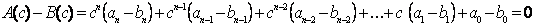 Определение. Многочлены называются тождественно равными, если при всех значениях переменной их значения совпадают. Теорема 1. У равных многочленов равны коэффициенты при соответствующих степенях переменной. Доказательство: 1.Если коэффициенты при соответствующих степенях переменной равны, то многочлены равны. При любом значении х=с, значения многочленов равны. А(с) – В(с) = 0 2. Если многочлены равны, то и коэффициенты при соответствующих значениях х равны. А(х) = В(х) Вычтем значения многочленов в столбик: Но сумма может быть равна 0 при любом с только если значения всех выражений в скобках равно 0, значит
