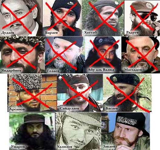 1996 год –Джохар Дудаев, уничтожен самонаводящейся ракетой 2001 год – Арби Бараев был убит в доме во время спецоперации 2002 год – Иорданец Эмир Хаттаб был отравлен письмом с боевым ОВ 2002 год – В больнице г.Соликамска умер Салман Радуев. 2004 год – Зелимхана Яндарбиева взорван. Спецоперацияпроведена офицерами ГРУ в столице Катара Дохе. 2004 год – В горном ущелье при стычке с погранцами был смертельно ранен Руслан Гелаев. Умер от патери крови. 2004 год – В ходе жестокого боя с армейским спецназом был убит лидер арабских наёмников Абу аль Валид. 2005 год – В ходе спецоперации ФСБ был уничтожен Аслан Масхадов. 2005 год – Грозненские милицейские уничтожили Ваху. 2006 год – Новоиспечённый президет Ичкерии Абдул Халим Сайдулаев был убит на окраине Аргуна.
