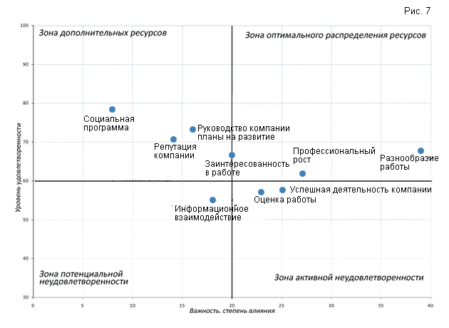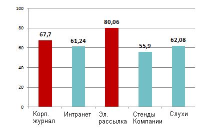 В результате системной работы по направлениям развития корпоративной культуры в 2011 году общий индекс удовлетворенности вырос на 7%. Результаты исследования показали, что у нас в компании есть зоны неудовлетворенности, в результате чего возникает недоверие сотрудников к руководству Увеличение степени удовлетворенности наблюдается по всем 10 факторам. Наибольший рост удовлетворенности по сравнению с 2010 годом по следующим факторам: · — оценка работы и признание результатов — на 15%; · — профессиональное развитие — на 13%; · — атмосфера в коллективе — на 12%; · — информационное взаимодействие — на 9%; · — принятие ценностей компании в сравнении с 2010 г. в среднем увеличилось на 7,4%; доверие — на 10%; ответственность — на 11%. Примечательно во всей этой работе то, что мы не просто реализовали план мероприятий, которым нам было интересно заниматься или который, по мнению руководства, был наиболее правильным. Мы работали над «западающими» факторами, которые были значимы для сотрудников. В результате реализации этого плана мероприятий повысилась удовлетворенность сотрудников разными сторонами жизни в компании. Можно смело сказать, что увеличение степени удовлетворенности всеми значимыми факторами работы в компании — одно из условий повышения эффективности работы и производительности труда, что мы и проследили в нашей компании.