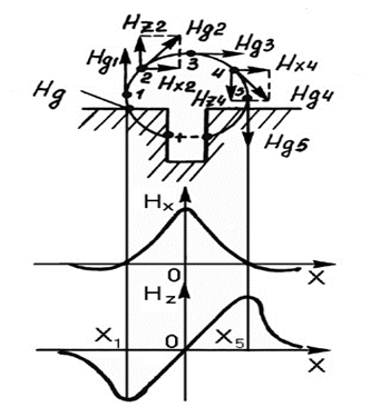 Например, по рис. 21 определим градиент нормальной составляющей поля дефекта в точке 2 (i = 2):
