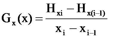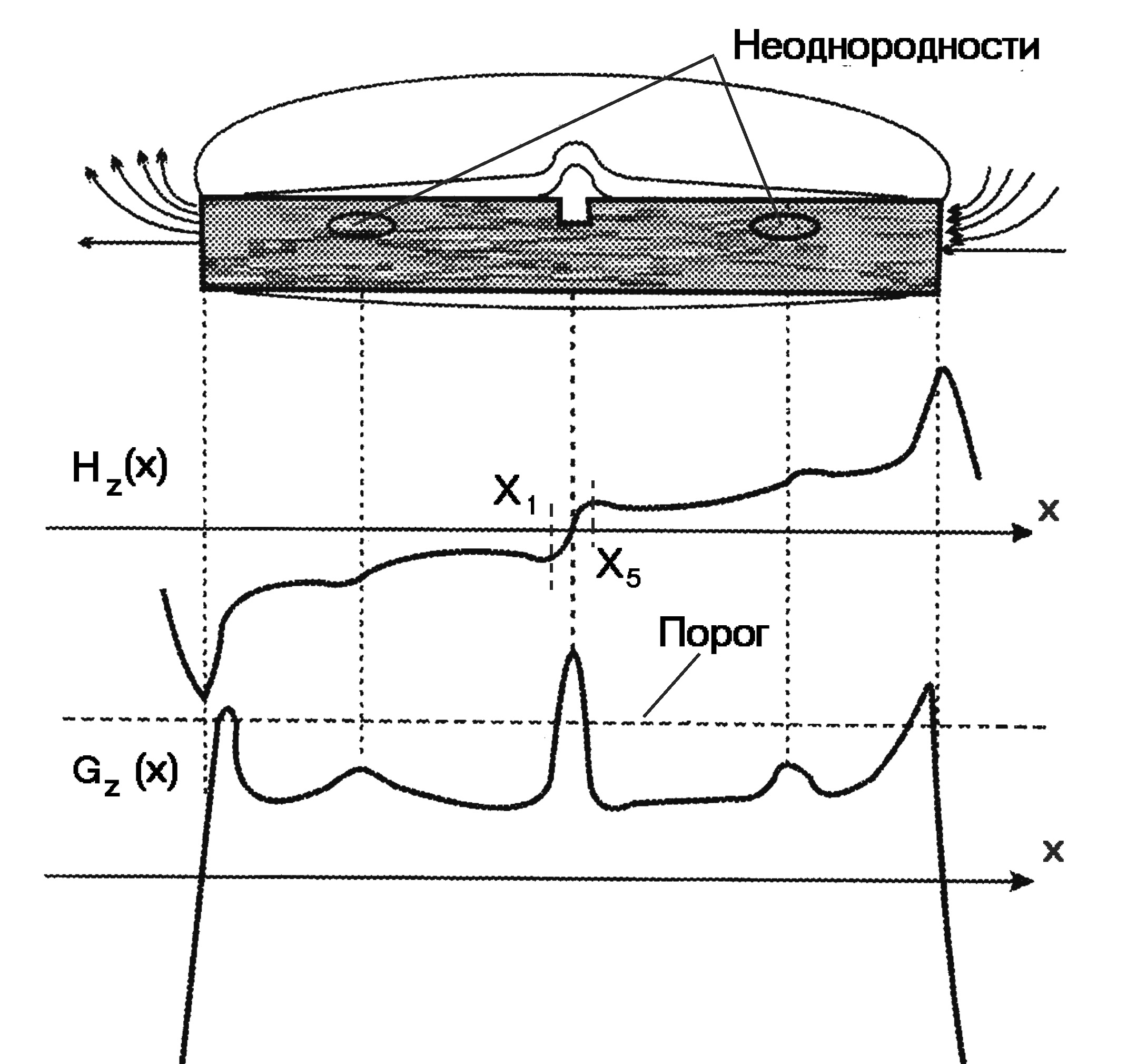 Рис. 22. Реальная функция градиента Hz(x) На практике измерять градиент в виде производной сложнее и к тому же необязательно. Его величину оценивают как частное от деления разности значений напряженности в двух его соседних точках (последующей и предыдущей) в направлении намагничивания детали на расстояние между этими точками. Для однородных полей значение градиента равно нулю, для неоднородных – отлично от нуля. Различают градиенты по тангенциальной и нормальной составляющим, определяемым соответственно как