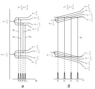 7.8а-суретте Н-магнит өрісінің бір мəніне келетін жіктелу көрсетілген. Компоненттер аралығындағы өте жұқа құрылымның, магниттік деңгейлерге жіктелуі, mJ = 1/2 жəне mJ = -1/2 мəнінде жиіліктері төрт мəнге ауысады: ν1; ν 2; ν 3; ν 4. бұл радиотолқынның сантиметрлік диапазонына сəйкес келеді.