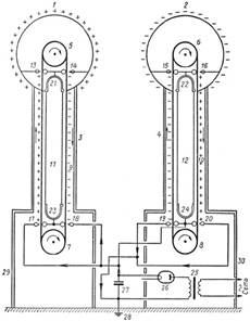 Ү лкен жарты металл шар 1 жəн 2 (диаметрі 1 – 10 м дейін) изаляц ияланған 3 жəн е 4 жартылай калоннаға бекітілген. Шарлар жəне колонна ішінде айналатын 5,,7 жəне 8 шки фті ленталар қозғалады 9,10 (изол цияланған материалдан жасалған). Кеңістік ішіндегі екі жартыл ай лентада изоляциаланған 11 жəне 12 пласти на орналасқан. 17 жəне 19 үшкір жүйе арқ ылы, жоғары вольтті түзеткіштен шыққан заряд көмегімен лента зарядталады. Жоғары вольтті түзеткіш; жоғарылатқыш трансфарматор–25; кенот он-26 жəне конденсатор-27 тұрады. 9-лента оң зарядпен, ал 10-лента теріс зарядпен зарядталған. Осы зарядтар лентамен бірге 1 жəне 2 шар і шінде көтеріледі де, 13 жəне 15 үшкір жүйе арқылы алынып тасталады. Лентаның төмендеуші бөлігі, таңбасы қарама-қарсы электр мен зарядталад ы. Осы заряд үшкір 14 жəне 16 ар ылы іске асырылады, ал 18 жəне 20-шы ү шкірі арқылы разрядталады.