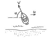 3.9 Катер должен пересечь реку шириной L = 60 м так, чтобы причалить точно напротив места отправления. Скорость течения реки u = 0,3 м/с. Время в пути, измеряемое в секундах, равно где — острый угол между осью катера и линией берега (см. рис.). Под каким минимальным углом к берегу нужно направить катер, чтобы время в пути было не больше 200 с? Ответ дайте в градусах.