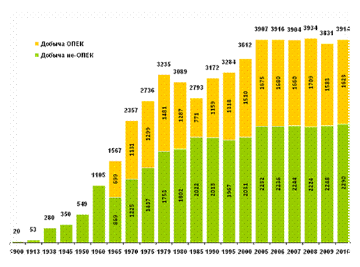 Развитие мировой нефтедобычи можно поделить на два этапа: Первый этап - с самого начала до 1979 года, когда был достигнут первый относительный максимум нефтедобычи (3235 млн. т.).Второй этап - с 1979 года по настоящее время. Было отмечено, что с 1920 года по 1970 год мировая нефтедобыча увеличивалась не только почти в каждом новом году, но и по десятилетиям добыча росла практически в геометрической прогрессии (увеличивалась почти вдвое за каждые 10 лет). С 1979 года происходит замедление темпов роста мировой нефтедобычи. В начале 80-х даже происходит кратковременное снижение добычи нефти. В дальнейшем рост объемов добычи нефти возобновляется, но уже не такими стремительными темпами как на первом этапе.