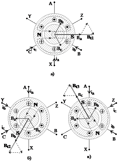 На рис. 6.6, а, б, в показаны схематические картины магнитного поля для различных моментов времени, следующие друг за другом. В момент времени t1, при котором (ωt1 = 90°), ток в фазе А положителен и равен Im, в фазах В и С токи отрицательны и составляют по величине 0,5Im (рис. 6.5). Выберем условно положительные направления токов трёхфазной обмотки статора. Пусть положительный ток iа в фазе А направлен от её конца X к началу A, тогда в фазах B и C токи ib, ic имеют противоположное направление. На рис. 6.6, а направления токов обозначены крестиками и точками.