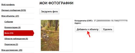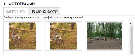 В блоке «Фотографии» на вкладке «Загрузить» загрузите фотографии объекта с компьютера либо на вкладке «Из моих фото» выберите изображения объекта из сохраненных на сайте фотографий.