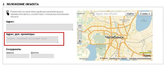 Сервис автоматически определяет адрес нахождения объекта, однако точность его определения не всегда высока. Поэтому следует внимательно посмотреть, какой адрес указывает программа. Если он не верен или не полон, необходимо его уточнить в поле “Адрес, доп. ориентиры”. Для объектов, находящихся в городской черте указывается адрес ближайшего дома и расположение объекта относительно его. Например: ул. Ленина, дом. 11, в 100 м к северу, на пустыре. Для объектов, находящихся вдали от населенных пунктов необходимо указывать точную привязку к ближайшим населенным пунктам, дорогам, ключевым ориентирам. Например: Сосновский район, 7ой км трассы М51, 2 км к востоку от деревни Вахрушево.