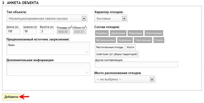 Внесение информации о свалке или другом несанкционированном месте скопления мусора на сайт