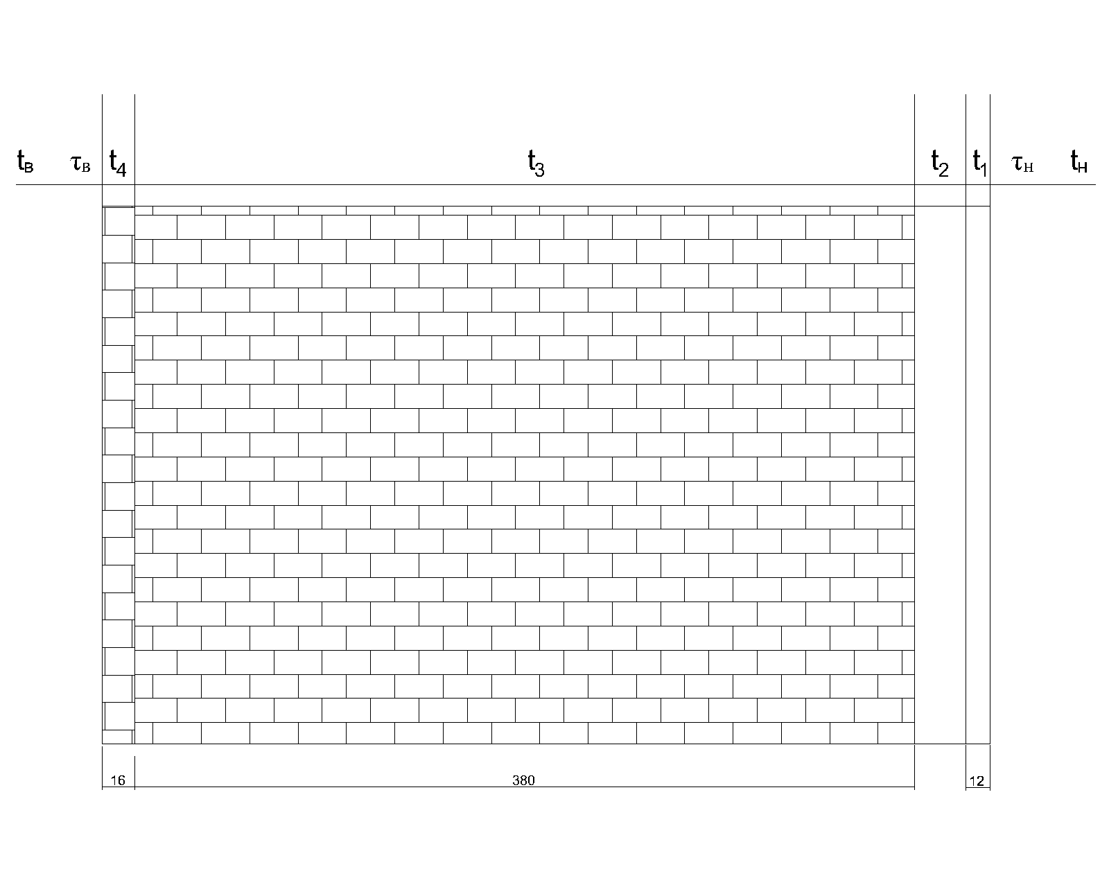 1– Сухая штукатурка 2 – Плиты минеральноватные жесткие (100 кг/м3) 3 – Кирпич глиняный обыкновенный (1600 кг/м3) 4 – Раствор цементно-песчанный Теплофизические характеристики материалов в конструкции 1.3.1 При tв=18˚С и относительной влажности φв=52 %, в помещении нормальный режим влажности.
