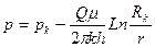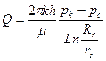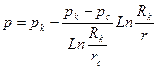 При плоскорадиальном движении векторы скорости фильтрации направлены по радиусам к оси скважины, поэтому давление и скорость фильтрации зависят только от одной координаты r. При этом во всех горизонтальных плоскостях поле скоростей и давлений будет одинаковым. Примером плоскорадиального фильтрационного потока является приток к гидродинамически совершенной скважине, вскрывшей горизонтальный пласт бесконечной протяженности на всю мощность пласта и сообщающейся с пластом через полностью открытую боковую поверхность цилиндра, отделяющую ствол скважины от продуктивного пласта. Поток будет также плоскорадиальным при потоке к совершенной скважине радиуса rc, расположенной в центре ограниченного горизонтального цилиндрического пласта мощностью h и радиусом Rк (рис. 1.5). Если на внешней границе пласта, совпадающей с контуром питания, поддерживается постоянное давление p к, а на забое скважины постоянное давление p с, пласт однороден по пористости проницаемости, фильтрация происходит по закону Дарси, то объемный дебит скважины определится по формуле Дюпюи: