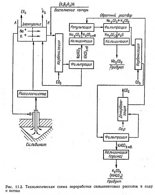 В настоящее время месторождения калийных солей (сильвинита и карналлита) разрабатываются шахтным способом. Однако в сложных горно-геологических условиях или при глубоком залегании добыча калийных солей шахтным способом экономически нецелесообразна. Возможность разработки глубоко залегающих калийных месторождений подземным растворением пытались обосновать многие ученые как в России, так и за рубежом (П.И. Преображенский, А.Е. Рыковский, И.С. Успенский, И.С. Розенкранц, Е.И. Ахумов и др.). В 1944-1945 гг. А.Е. Ходьковым и Ю.В. Морачевским была предпринята первая попытка растворения Соликамских карналлитов через скважину, производительность которой составляла 20 м3/ч. Среднее содержание соли в растворе равнялось 280 г/л. Полученный раствор содержал незначительное количество КС1, и его промышленная переработка оказалась нерентабельна. Для первых испытаний выбор карналлита в качестве объекта растворения был сделан неудачно, поскольку карналлит при растворении образует рассол с высоким содержанием MgCl и весьма незначительным содержанием KCl. Холодный способ растворения для карналлита непригоден, так как при этом образуется раствор с небольшим содержанием KCI. Однако теоретические исследования указывают на возможность промышленного получения КCl методом подземного растворения карналлита через скважины. Установлено, что для эффективной добычи калийных руд через скважины необходимо; Вести селективную добычу КСl насыщенным по другим компонентам раствором трудно по причине невысокого содержания КСl в руде (до 30%). Суть технологии переработки рассолов ПР-сильвинита на соду и поташ ясна из схемы (рис. 11.3) и включает в себя электролиз добытых рассолов и карбонизацию каталита.