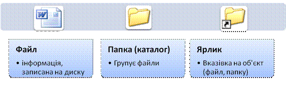 Документ (файл) це іменований блок інформації, який зберігається на носії інформації. Ім’я файла складається з власного імені та розширення, які розділені крапкою, наприклад: config.sys, autoexec.bat, risunok.bmp. Розширення вказує на тип файлу (текстовий, графічний та ін.) і програму, яка відкриває файл. Зміна розширення веде до зміни програми. Якщо розширення не написати в імені, то система видасть запит: якою програмою відкривати файл? Папки, які створюються, представляються значками та іменами. Відкриття порожньої папки призводить до появи порожнього вікна, у якому можна розмістити документи, ярлики та папки. Імена документів і папок, при їх створенні, визначає користувач. Ярлик- це посилання на об’єкт, який знаходиться у файловій системі. За допомогою ярликів виклик об’єкта відбувається швидше. Найчастіше, імена ярликів визначаються іменем об'єкта, на який вказує даний ярлик. Файлова система - це спосіб організації даних, який використовується операційною системою для збереження інформації у вигляді файлів на носіях інформації. Також цим поняттям позначають сукупність файлів та каталогів, які розміщуються на логічному або фізичному пристрої. Структуру файлів і папок зручно зображати у вигляді дерева каталогів.