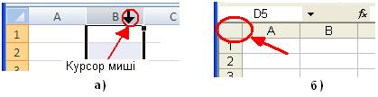 Порядок копіювання мишею: ¾ ¾ Встановити курсор миші на маркер заповнення. ¾ Потягнути маркер у потрібному напрямку. Порядок переміщення мишею: ¾ Виділити потрібну комірку (декілька комірок). ¾ Встановити курсор миші на границю курсорної рамки. ¾ Потягнути курсорну рамку у потрібному напрямку. Виділення діапазону комірок. Більшість команд Excel оперують з активною коміркою або діапазоном комірок. Для виділення суміжного діапазону комірок слід за допомогою миші (утримуючи ліву клавішу миші натиснуто) провести по потрібним коміркам. Для виділення колонки або рядка слід клацнути мишею по заголовку колонки або номеру рядка (Рис. 2а). Для виділення несуміжного діапазону чарунок слід, утримуючи натиснуто клавішу [Ctrl], клікати курсором миші по комірках, які потрібно виділити. Виділити всі комірки одразу можна натисненням сірої кнопки на перетині лінійок назв комірок (рис.2б).