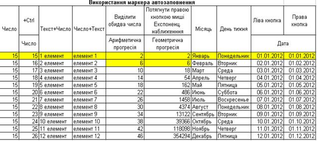 а) б) Рис. 2 Наприклад: =СРЗНАЧ(A2:А10), значенням цієї функції буде середнє арифметичне восьми чисел, які знаходяться у діапазоні комірок від А2 до А10. Функції Сума, Мінімум, Максимум, Середнє використовуються в електронних таблицях часто, - тому для них на панелі інструментів Главная знаходиться спеціальна кнопка å (Автосуммирование). Якщо активізувати комірку та натиснути кнопку å, то з’явиться формула суми, яку можна модифікувати. Прогресіяі автозаповнення. В електронних таблицях є можливість заповнення комірок різними типами прогресій. Прогресії використовуються для нумерації комірок, для введення послідовності значень. В наступній таблиці представлені різні способи створення різних прогресій. Для створення прогресії слід потягнути курсором миші за маркер заповнення курсорної рамки (Рис.3). Заповнення можна робити як по горизонталі, так і по вертикалі. В деяких випадках потрібно утримувати клавішу Ctrl.
