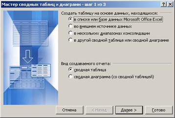 1. Викликати майстра зведених таблиць Данные – Сводная Таблица. У діалоговому вікні виставити наступні параметри: Створити нову таблицю на основі списку або бази даних; Вид створюваного звіту – зведена таблиця.