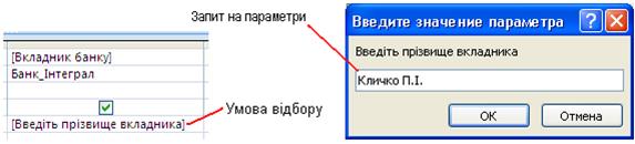 В області вибраних полів є рядок Условия отбора, який слід використовувати для відбору і фільтрації даних (Рис. 3). Рядок Или цього вікна дозволяє ввести додаткову умову для фільтру. В умові використовують знаки <, >, = для даних типу Число, Счётчик, Дата, параметри True, False, And, Or, порівнюють текстові значення. Для числових значень використовують знаки порівняння <, >, =, <>, >=, <=. Для дати використовують знак «#». Наприклад запис: > #1.09.2012# означає всі дати після 1.09.2012. Для текстових значень використовують лапки «». Наприклад, запис «Західне» означає відбір всіх записів із такою назвою. Також в умові використовують квадратні дужки [ ]. Якщо, потрібно вивести запит з якоюсь назвою, то в полі умови в квадратних дужках пишуть текст запиту. Такий запит називають параметричним. Тоді після виклику запиту з’явиться діалогове вікно, в якому слід ввести дані. Наприклад (Рис. 3):