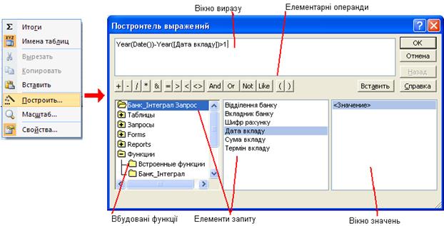 Рис. 3 Побудова виразів (Построитель выражений) для вибірки. 1. Викликати контекстне меню в Условие отбора і вибрати команду Построить (Рис. 11.4). 2. У вікні Побудови виразів (Построитель выражений)побудувати вираз, використовуючи елементарні операнди та вбудовані функції. Подвійний клік мишею у вікні на елементі запиту робить підстановку його у вираз. 3. Натиснути ОК.