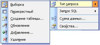 Рис. 4 Існує декілька видів запитів: на вибірку, на додавання, на виділення, на оновлення. Змінити тип запиту можна у вікні конструктора, викликавши контекстне меню в області таблиць для запиту Тип запроса (Рис. 5).
