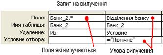 Запит на додавання дозволяє додавати записи з таблиці 1 у таблицю 2 БД. Тому потрібно, щоб у запиті були вказані поля, спільні для обох таблиць БД. Порядок створення запиту на додавання. 1. Створити простий запит для таблиці 1, вибравши всі поля таблиці. 2. Перейти в режим конструктора. 3. Вибрати (в контекстному меню) тип запиту Добавление. 4. В діалоговому вікні вказати назву таблиці 2, куди будуть додані записи (Рис. 6б). 5. В конструкторі в рядку Додавання будуть відображені всі поля таблиці 2, що відповідні полям таблиці 1. В режимі таблиці можна переглянути записи, які будуть додані. 6. На панелі інструментів натиснути кнопку 7. Закрити вікно запиту. Переглянути результати у таблиці 2. Запит на видалення дозволяє вилучати записи з таблиці БД. Запит на вилучення робиться аналогічно запитам на додавання (Рис. 7).