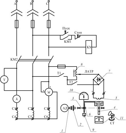 1. По конспекту лекций изучите устройство, принцип действия и характеристики трехфазного асинхронного двигателя. 2. Ознакомьтесь с лабораторной установкой, принципиальная электрическая схема которой приведена на рис. 10.2. При нажатии кнопки «ПУСК» переменное трехфазное напряжение через соответствующие предохранители и замкнутые контакты КМ2 магнитного пускателя КМ поступает к выводам С1, С2 и С3 трехфазной обмотки статора двигателя, соединенной по схеме «звезда». Для измерения необходимых параметров двигателя включены соответственно вольтметр, миллиамперметр и ваттметр. Вал 1 трехфазного асинхронного двигателя с короткозамкнутым ротором эластичной муфтой 2 соединен с валом 3 измерительно-нагрузочного устройства, состоящего из электромагнитного тормоза и моментомера. Электромагнитный тормоз состоит из алюминиевого диска 4, жестко закрепленного на валу 3, обмоток возбуждения 5 электромагнитного тормоза, установленных на другом диске 6, которые с помощью подшипника также установлены на валу 3. Обмотки возбуждения 5 подключаются к источнику постоянного напряжения 7, величину которого можно плавно изменять с помощью автотрансформатора 8. Автотрансформатор 8 и выпрямительное устройство 7 включаются соответственно тумблерами Т1 и Т2. Электромагнитный тормоз предназначен для создания переменной механической нагрузки вала асинхронного двигателя тормозным моментом Мг. Моментомер конструктивно совмещен с электромагнитным тормозом. К нижней части диска 6 прикреплен груз 9. К верхней части диска 6 прикреплена стрелка, которая при повороте диска 6 перемещается около неподвижной шкалы 10 моментомера. Моментомер предназначен для измерения вращающего момента Мг асинхронного двигателя. Для измерения частоты вращения вала двигателя n 2 служит строботахометр 11. Он представляет собой ламповый генератор регулируемой частоты, питающий осветительную лампу, и имеющий шкалу, градуированную в числах оборотов в минуту. Частота вращения вала измеряется бесконтактным способом, для чего алюминиевый диск 4 освещается прерывистым светом лампы. Если число оборотов диска (вала двигателя) и число вспышек лампы равны между собой, то диск кажется неподвижным. Если частота вспышек лампы больше или меньше, чем число оборотов диска, то диск представляется наблюдателю вращающимся в ту или иную сторону. Для удобства отсчета на диске наносится точка или черта.