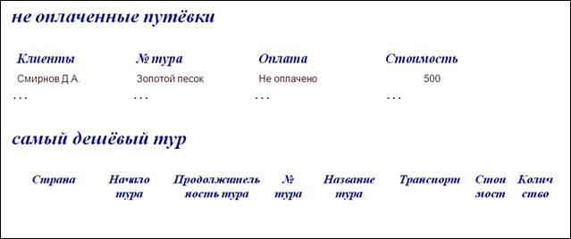 Выходная информация представляется в виде отчётов. · Туры по странам; · Самый дешёвый тур; · Неоплаченные путёвки;