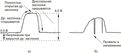 Рис. 3. Осциллограммы сигналов исправного (а) и неисправного (б) датчиков положения дроссельной заслонки * Продолжение. Начало см. «Ремонт & Сервис», № 6, 2002, с. 58.