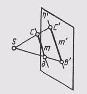 Проекции, полученные при центральном и параллельном проецировании, обладают рядом свойств. Проекция точки есть точка. При заданном центре Р (.или направлении S) проецированию любой точки А пространства соответствует на плоскости проекций п' единственная точка А'. При этом проекция точки В, лежащей в плоскости проекций, совпадает с самой точкой (см. рис. 3). Проекция прямой есть прямая. На рис. 46 лучи, проецирующие прямую т, создают плоскость S, которая пересекает плоскость проекций п' по линии m', являющейся проекцией на плоскость n'; S ~ т; S п п = т'. Проекция прямой определена, если известны проекции хотя бы двух ее точек (рис. 4). Если в пространстве прямая параллельна плоскости проекции п', то ее проекция параллельна самой прямой (рис. 7). При этом при центральном проецировании проекции отрезков пропорциональны самим отрезкам, а при параллельном — равны им. При параллельном проецировании сохраняется отношение величин отрезков прямой и их проекций (рис. 8): АВ/ВС = А'В'/В'С. При параллельном проецировании проекции параллельных прямых есть прямые параллельные (рис. 9). Если прямые т и п в пространстве параллельны, то и проецирующие их плоскости Sm и Sn тоже будут параллельны. При пересечении их с плоскостью проекций п' получаем т'|| п'. Проекцией плоскости является плоскость проекций. Плоскость состоит из бесконечного множества точек. При проецировании этого множества проецирующие лучи заполняют все пространство, а их точки пересечения с плоскостью проекций п' — всю плоскость проекций.