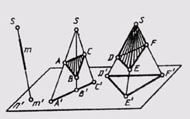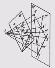Рис. 10а, б Так как положение любой плоскости в пространстве определяется тремя ее точками, не лежащими на одной прямой, то проекция трех таких точек плоскости (рис. 10, а) устанавливает однозначное соответствие между проецирующей плоскостью и плоскостью проекций n', которое позволяет определить проекции (рис. 10, б) любой точки D или прямой этой плоскости. Если плоскость параллельна плоскости проекций, то проекции ее плоских фигур при центральном проецировании подобны самим фигурам (рис. 11, а), а при параллельном — равны им (рис. 11,6).