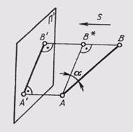 Ортогональное (прямоугольное) проецирование есть частный случай проецирования параллельного, когда все проецирующие лучи перпендикулярны плоскости проекций. Ортогональным проекциям присущи все свойства параллельных проекций, но при прямоугольном проецировании проекция отрезка, если он не параллелен плоскости проекций, всегда меньше самого отрезка (рис. 15). Это объясняется тем, что сам отрезок в пространстве является гипотенузой прямоугольного треугольника, а его проекция — катетом: А'В' = ABcos a. При прямоугольном проецировании прямой угол проецируется в натуральную величину, когда обе стороны его параллельны плоскости проекций, и тогда, когда лишь одна из его сторон параллельна плоскости проекций, а вторая сторона не перпендикулярна этой плоскости проекций. Теорема о проецировании прямого угла. Если одна сторона прямого угла параллельна плоскости проекций, а вторая ей не перпендикулярна, то при ортогональном проецировании прямой угол проецируется на эту плоскость в прямой же угол.
