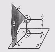 Рис. 16 Пусть дан прямой угол ABC, у которого сторона АВ параллельна плоскости п' (рис. 16). Проецирующая плоскость перпендикулярна плоскости п'. Значит, АВ _|_S, так как АВ _|_ ВС и АВ _|_ ВВ, отсюда АВ _|_ В'С'. Но так какАВ || А'В' _|_ В'С', т. е. на плоскости п' угол между А'В' и В'С равен 90°. Date: 2015-07-24; view: 558; Нарушение авторских прав |