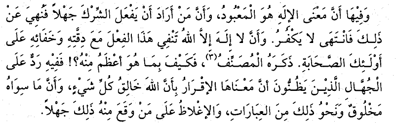 «И в ней (в этой истории) содержится то, что значение слова «аль илягь» это тот, кому поклоняются, и что тот, кто пожелал совершить большой ширк по невежеству, и ему запретили это, и он оставил это, не становится кафиром. И что «ля илягьа илля Ллагь» противоречит этому действию, хотя это и являлось неизвестным и скрытым для этих сподвижников. Упомянул это автор (книги Единобожия, см.главу 9), а как же в отношении того, что является ещё большим, чем это? И в этом далиль против джагьилей, которые считают, что значение слова «илягь» это признавание Аллагьа Творцом всякой вещи, и что нет подобного Ему из творений и тому подобное из высказываний…» См. Тайсир аль ГIазиз аль ХIамид Шейх сказал «пожелал совершить большой ширк (когда к слову ширк прибавляется определенный артикль, то «ашширк» значит большой ширк и никак иначе)» и не сказал «пожелал совершить действие, которое выглядит как ширк» вопреки толкованиям оппонентов. И это явно указывает на то, что мы говорим. А кому недостаточно, то пусть обратится к его книге «Тайсир аль ГIазиз аль ХIамид», которая является лучшим шархом на «Китаб Аттавхид». Посмотри на то, что он сказал в девятой главе, какие примеры он приводит и какие пользы упоминает, и ты увидишь что я говорю правду.
