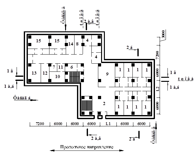 1 – вестибюль; 2 – гардероб; 3 – гардероб младших классов; 4 – кабинет; 5 – кладовая уборочного инвентаря; 6 – мастерские; 7 – кладовая; 8 – кабинет мастера; 9 – комната отдыха; 10 – санузел; 11 – учебная аудитория; 12 – складской кабинет; 13 – кинозал; 14 – киноаппаратная; 15 – кабинет Рисунок А.14 – План здания